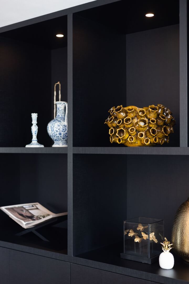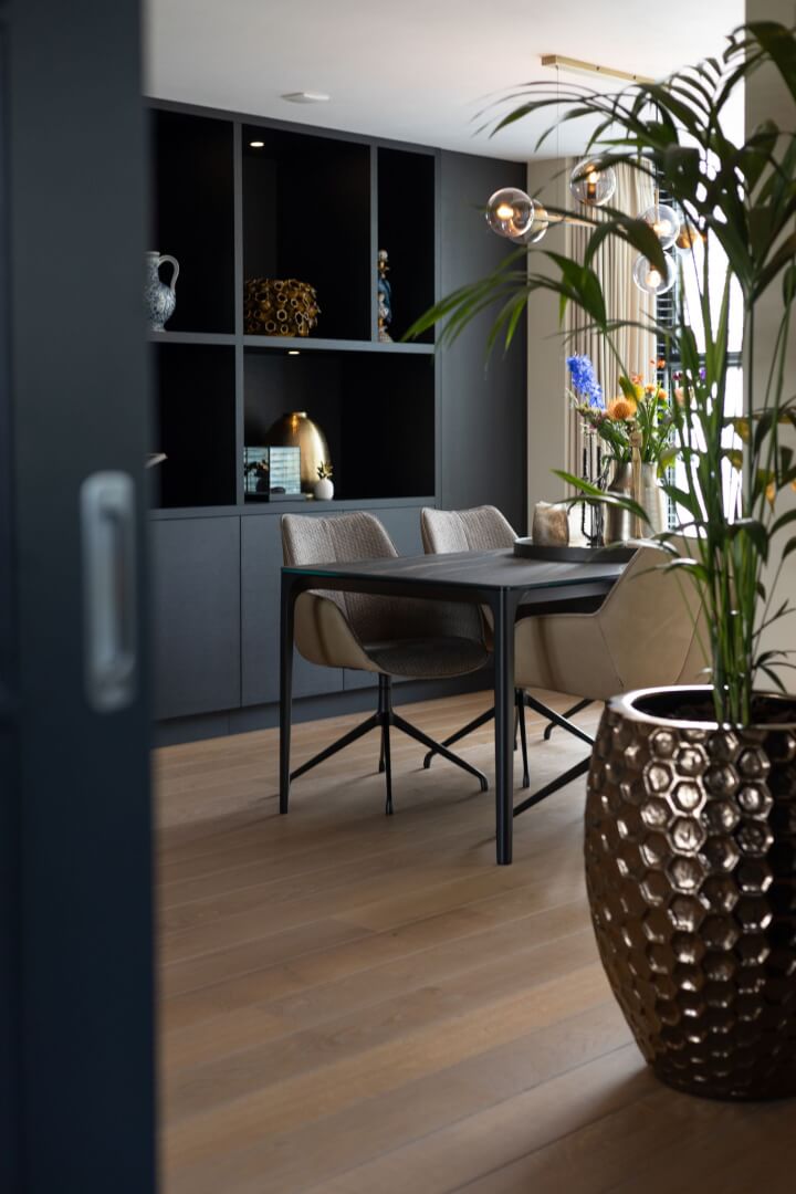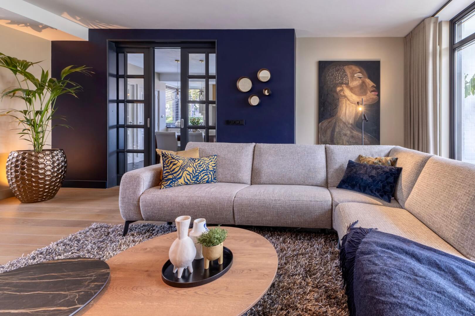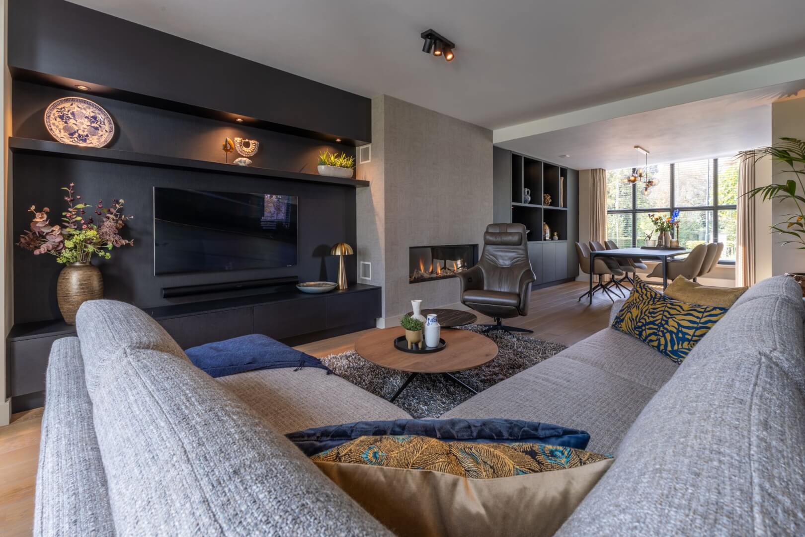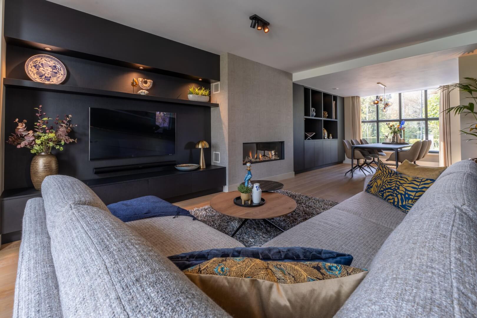 We hebben de 2 functies van het laag en het hoog zitten met elkaar verbonden door praktische en mooie maatwerk meubels. Aan de ene kant het tv meubel en aan de andere kant een servies/opbergkast. Beiden uitgevoerd in een exclusief decoratief plaatmateriaal. Daartussen de openhaard die weer bekleed is met prachtige muurbekleding. Nieuwe meubels, verlichting en deels de raambekleding in combinatie met de mooie warme kleuren royal blue, okergeel en zandtinten geven deze woning warmte en een luxe eigentijdse uitstraling!