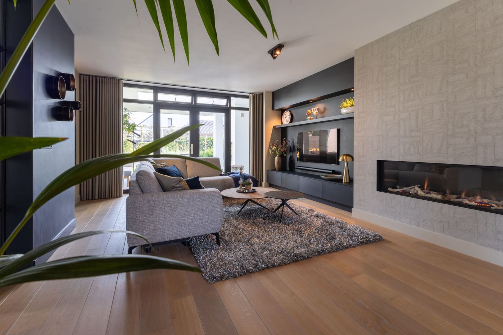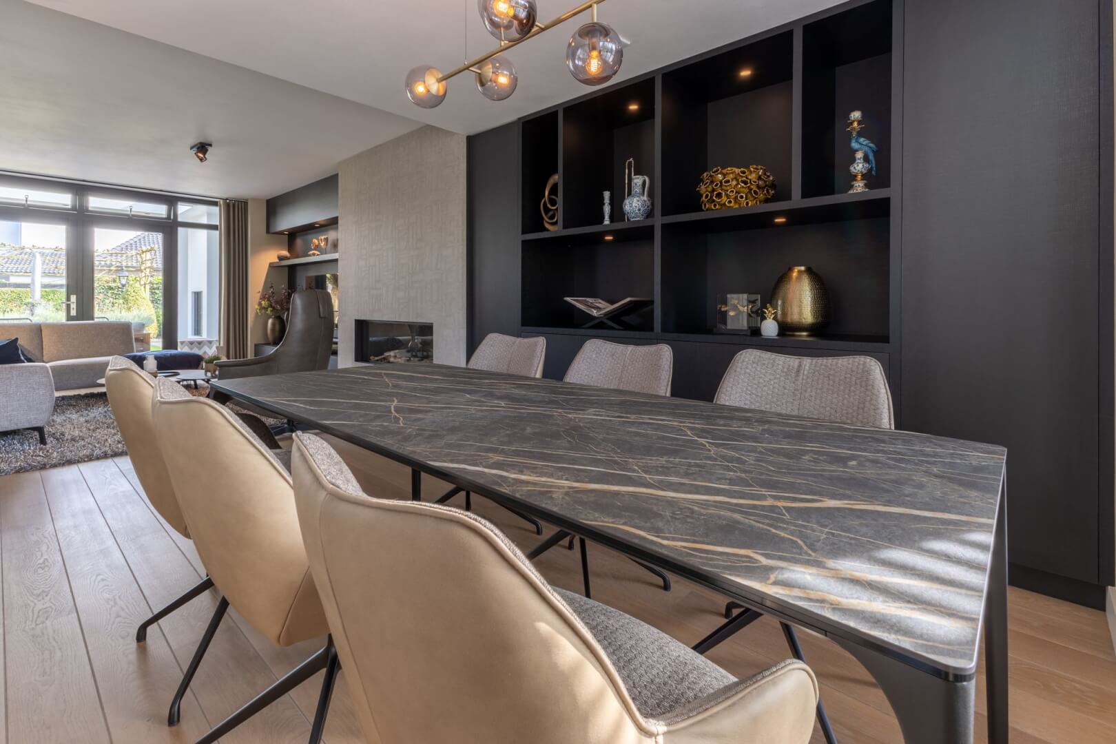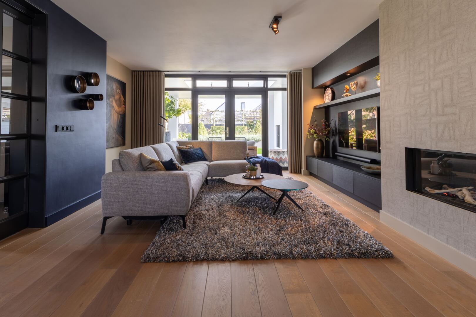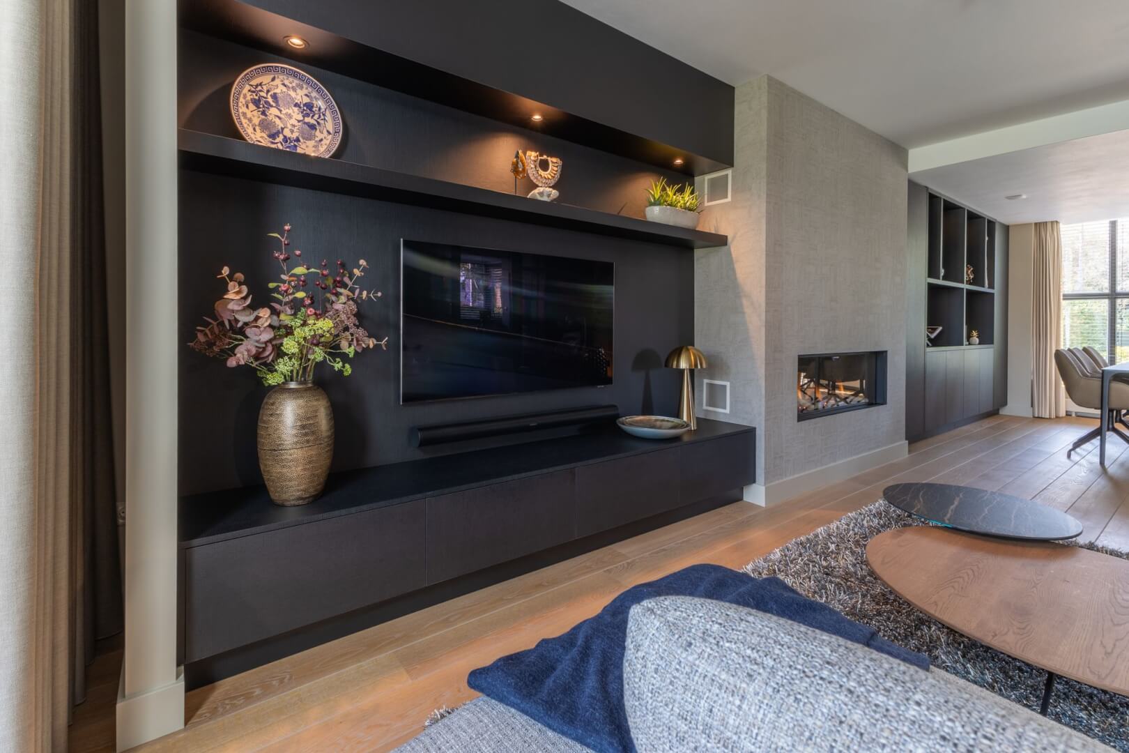 We hebben de 2 functies van het laag en het hoog zitten met elkaar verbonden door praktische en mooie maatwerk meubels. Aan de ene kant het tv meubel en aan de andere kant een servies/opbergkast. Beiden uitgevoerd in een exclusief decoratief plaatmateriaal. Daartussen de openhaard die weer bekleed is met prachtige muurbekleding. Nieuwe meubels, verlichting en deels de raambekleding in combinatie met de mooie warme kleuren royal blue, okergeel en zandtinten geven deze woning warmte en een luxe eigentijdse uitstraling!
