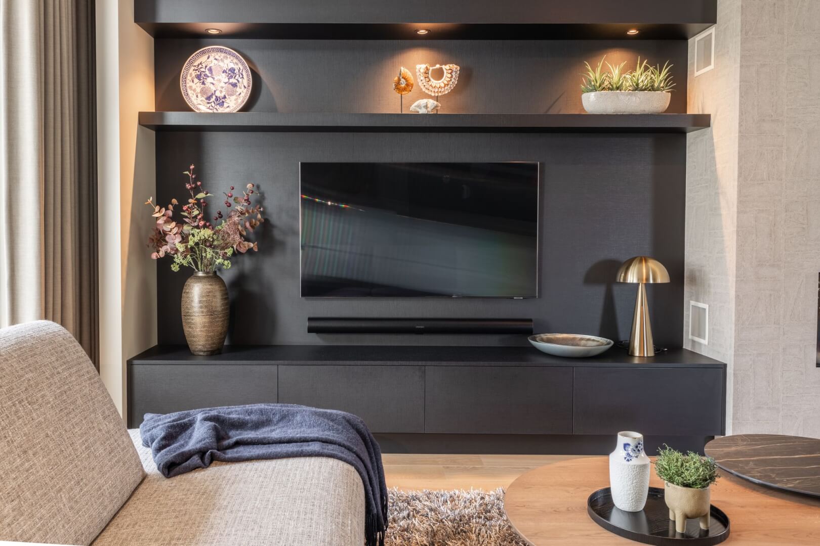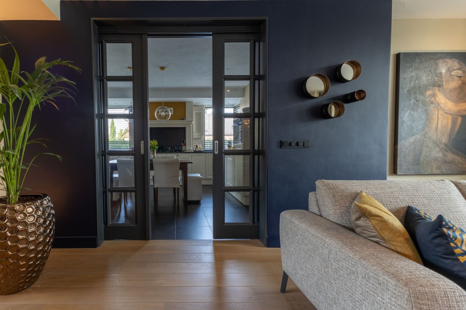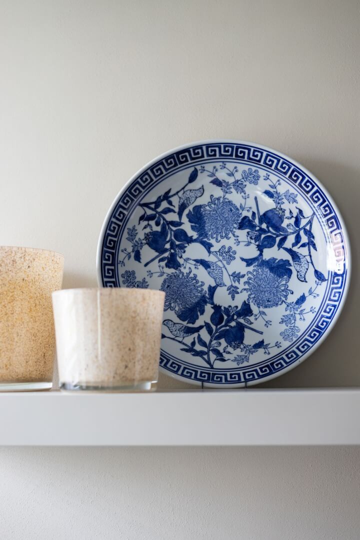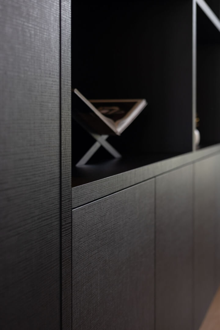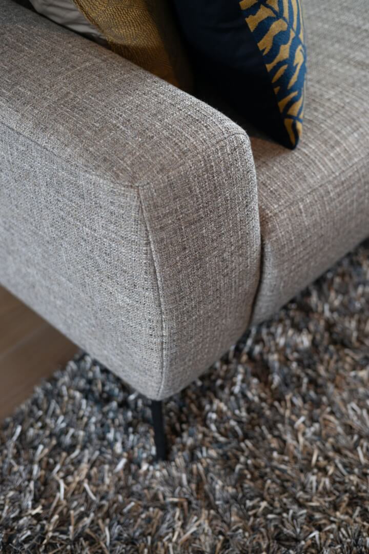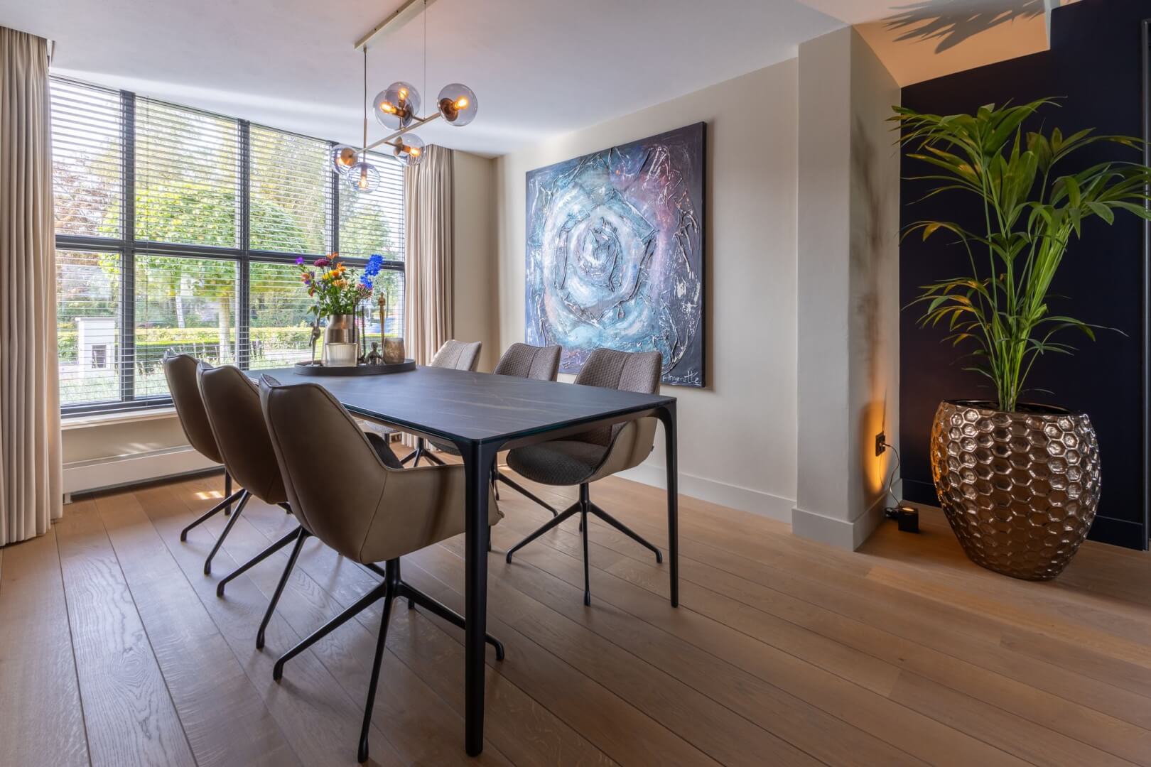 We hebben de 2 functies van het laag en het hoog zitten met elkaar verbonden door praktische en mooie maatwerk meubels. Aan de ene kant het tv meubel en aan de andere kant een servies/opbergkast. Beiden uitgevoerd in een exclusief decoratief plaatmateriaal. Daartussen de openhaard die weer bekleed is met prachtige muurbekleding. Nieuwe meubels, verlichting en deels de raambekleding in combinatie met de mooie warme kleuren royal blue, okergeel en zandtinten geven deze woning warmte en een luxe eigentijdse uitstraling!
