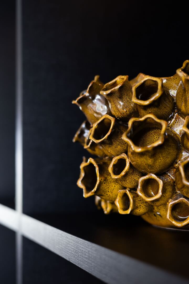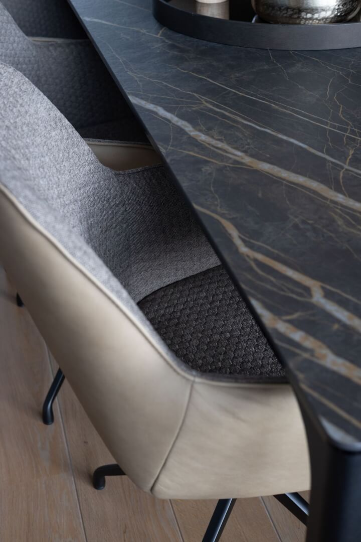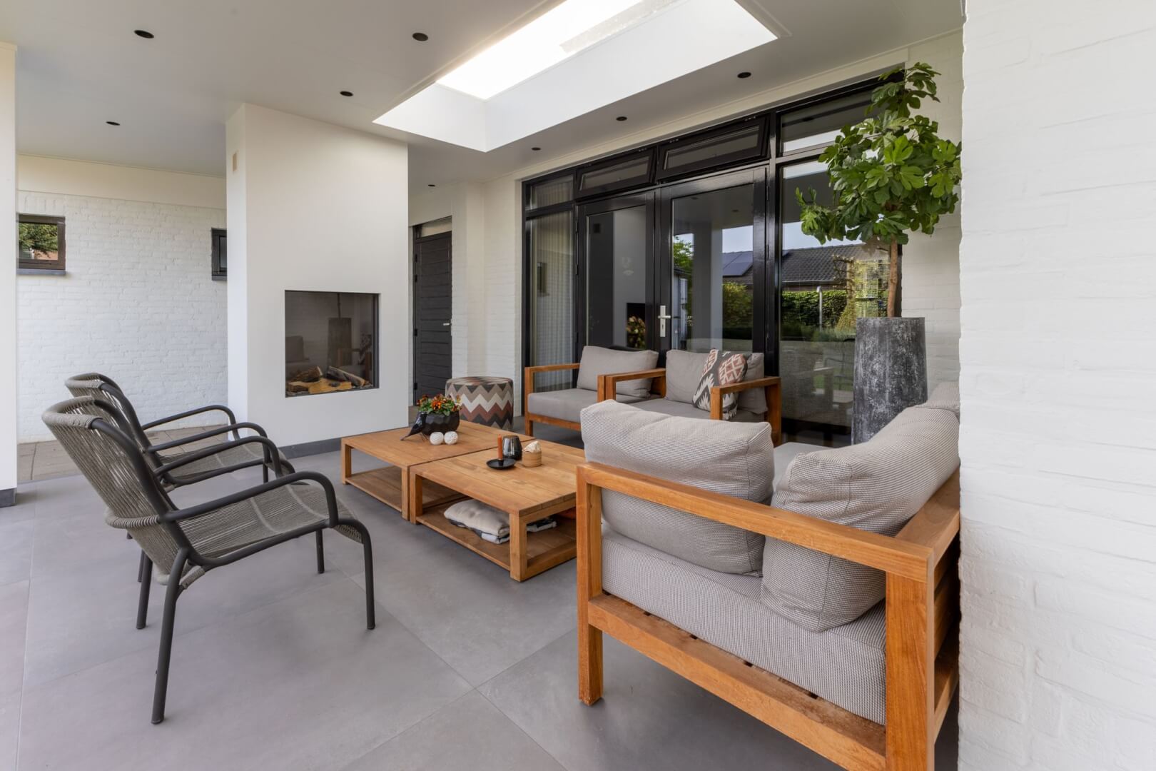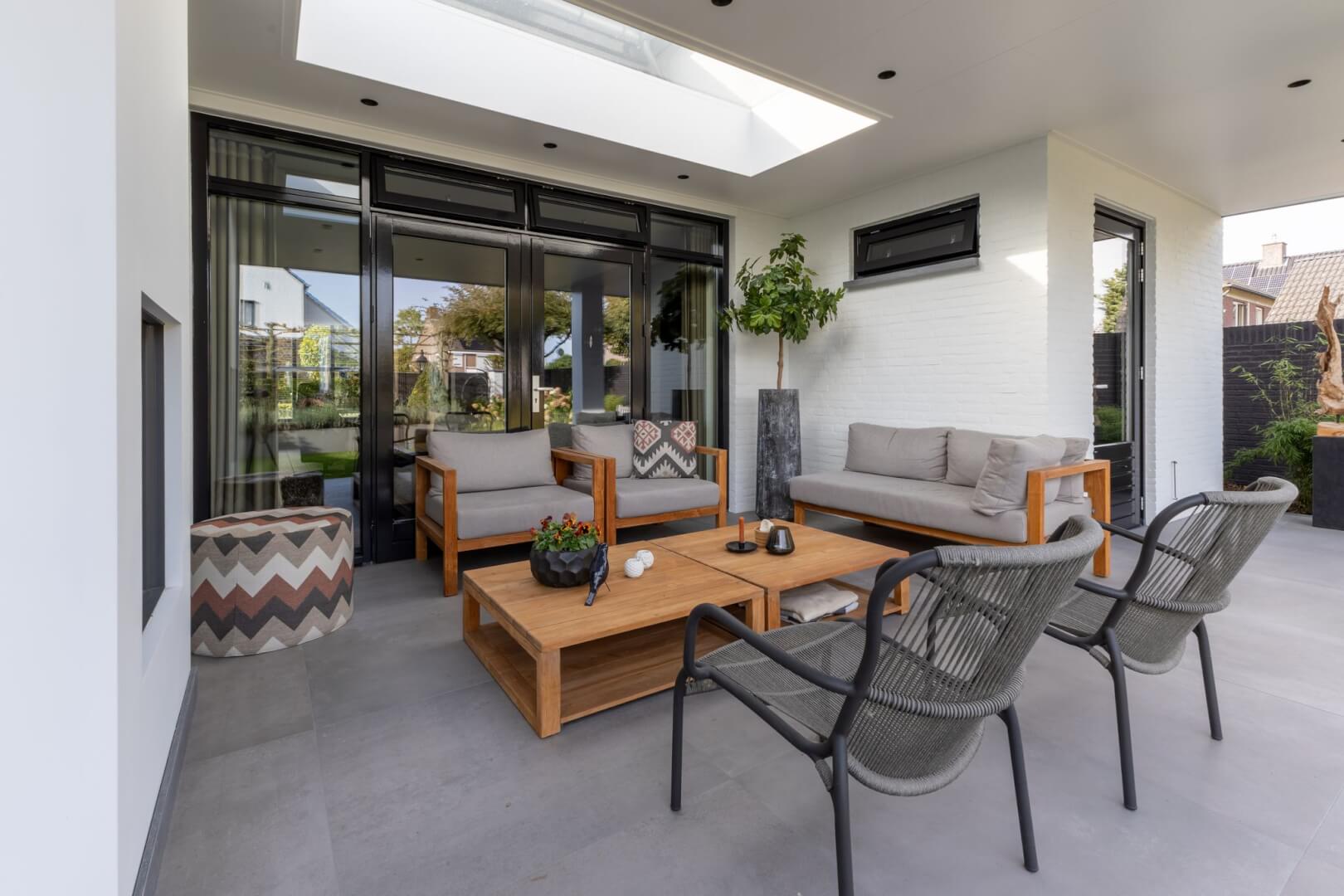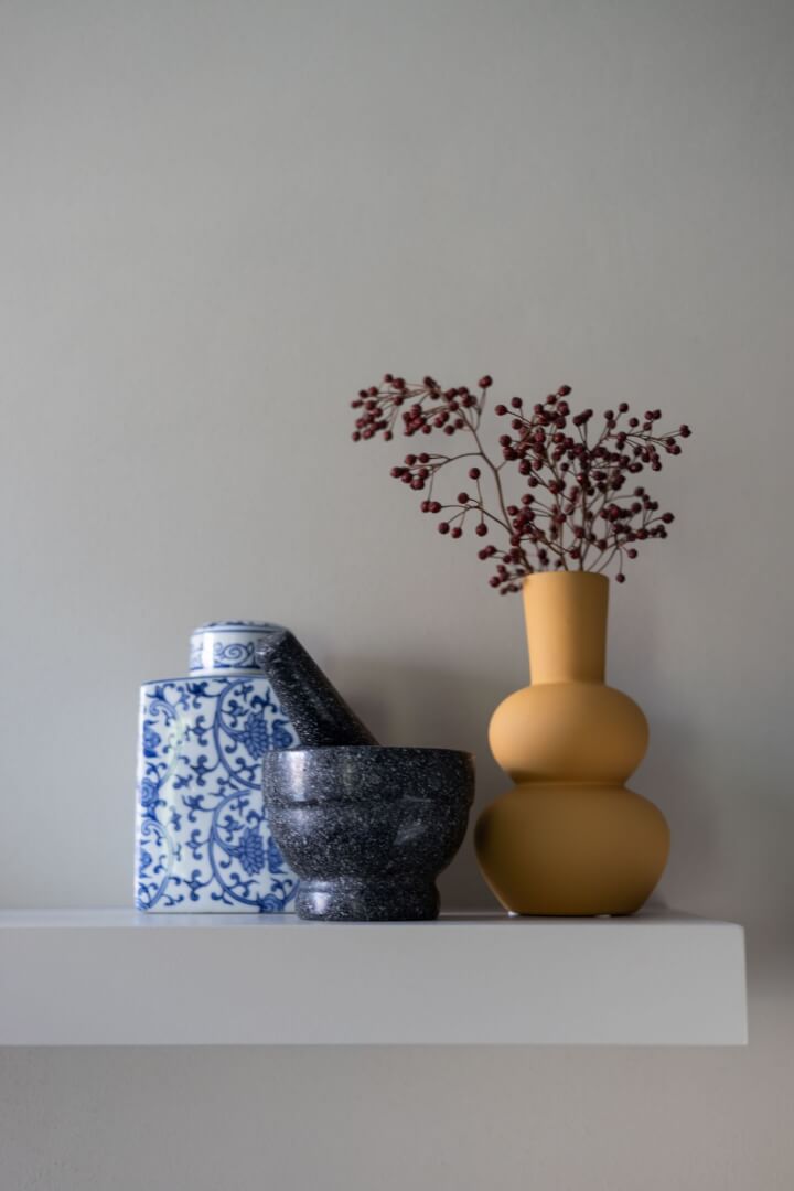 We hebben de 2 functies van het laag en het hoog zitten met elkaar verbonden door praktische en mooie maatwerk meubels. Aan de ene kant het tv meubel en aan de andere kant een servies/opbergkast. Beiden uitgevoerd in een exclusief decoratief plaatmateriaal. Daartussen de openhaard die weer bekleed is met prachtige muurbekleding. Nieuwe meubels, verlichting en deels de raambekleding in combinatie met de mooie warme kleuren royal blue, okergeel en zandtinten geven deze woning warmte en een luxe eigentijdse uitstraling!